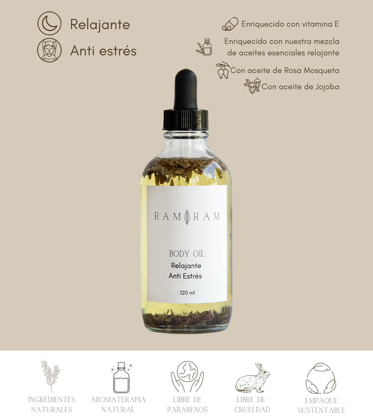 Calm your body and your senses with our relaxing body serum, which is created with light, easily absorbed oils and great properties for the skin. Our body serum is made with rosehip oil, jojoba oil, sesame oil, vitamin E and a mixture of our relaxing essential oils, which will help you nourish, moisturize, tone, improve the elasticity of your skin and unify the tone of your skin as well as attenuate scars.